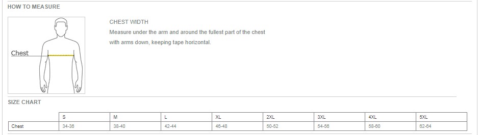 Chest Width: S-20, M-22, L-24, XL-26, XXL-28, XXXL-30, XXXXL-32